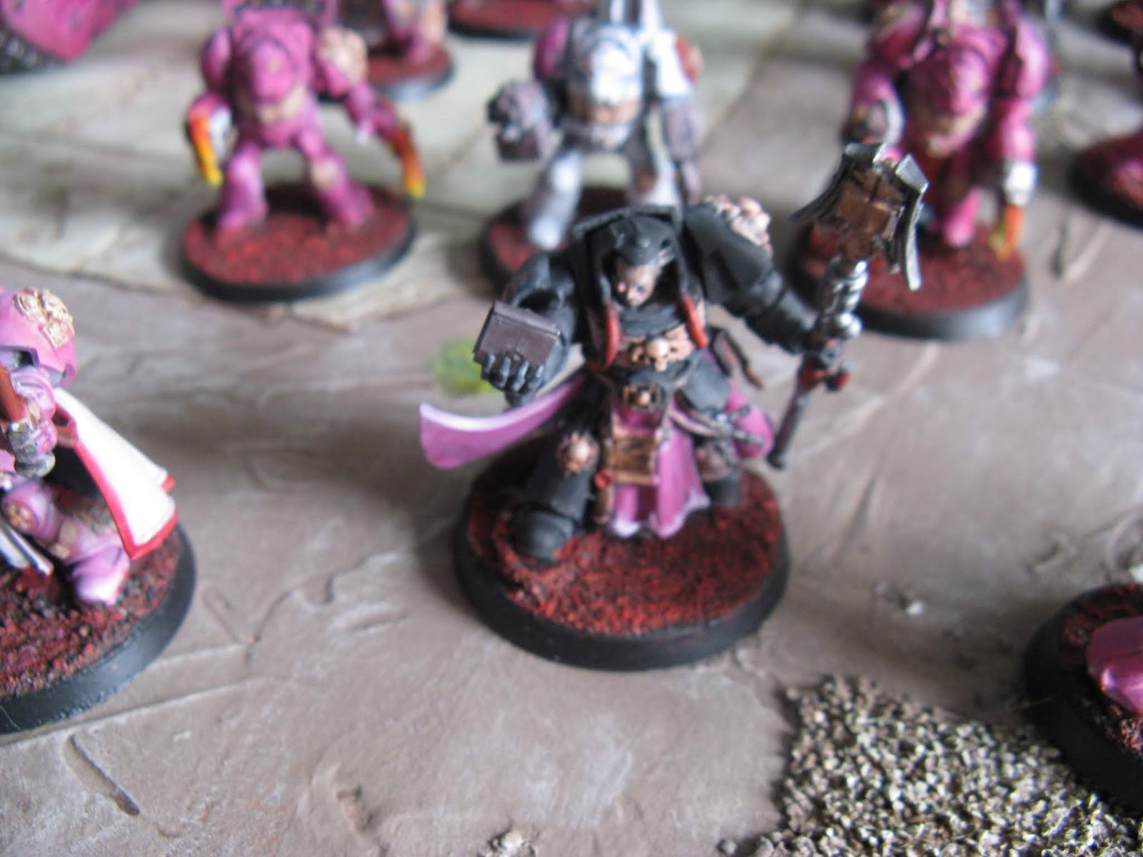 aujourd'hui, quelques photos parce que je viens à l'instant de terminer la peinture de mes terminators Pink Panthers. Je joue cette armée depuis mon retour à la V8 et j'ai surtout perdu des batailles avec. Je les utilise comme chapitre successeur des Dark Angels, et j'ai une passion malsaine pour ces vétérans en armures super lourdes.
